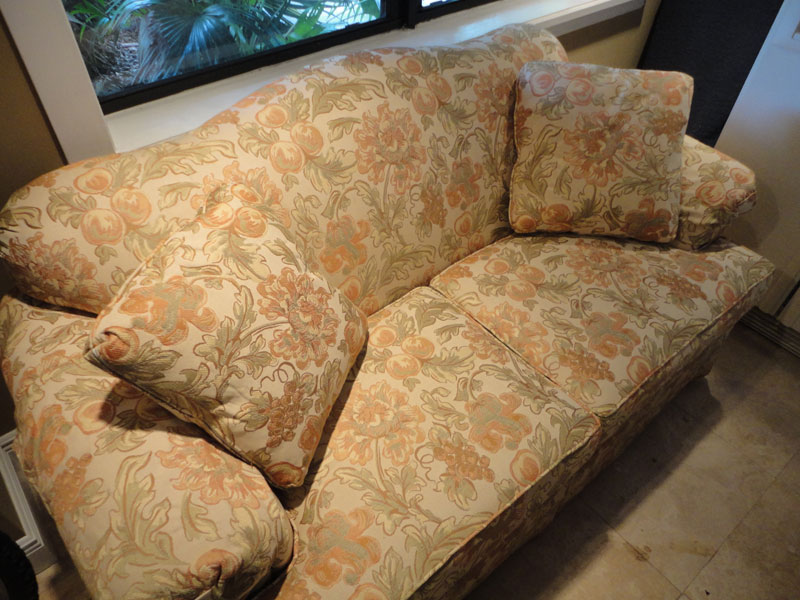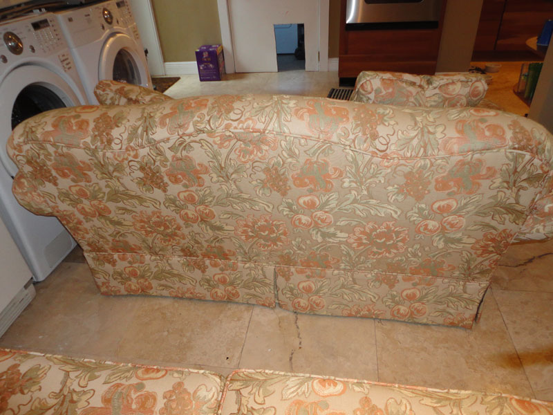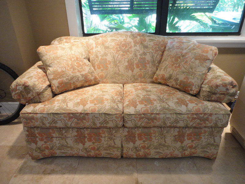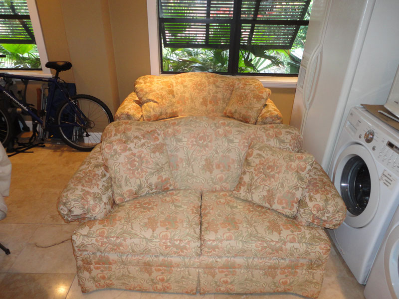 These are two matching love seats that are in very, very good condition. They have had professionally tailored slip covers on them since they were brand new. The couch fabric is bright and colorful (much more so than the pictures display).